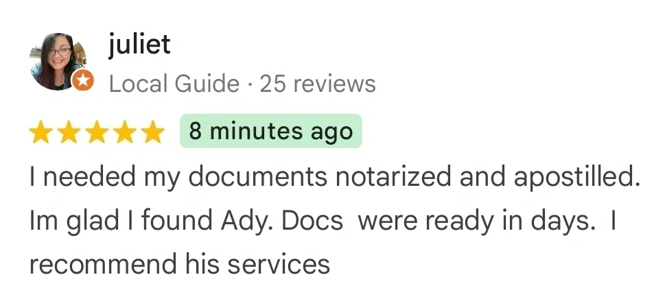 I needed my documents notarized and apostilled. Im glad I found Ady. Docs  were ready in days.  I recommend his services